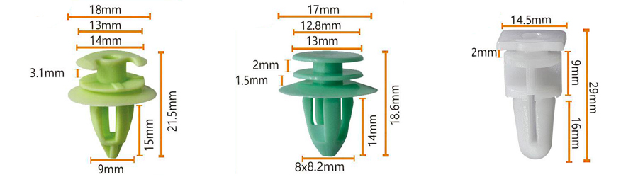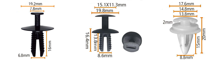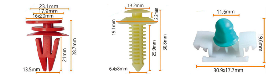 Clipes de liberação rápida de plástico: usados para fixar painéis da carroceria, pára -choques, arco de rodas e assim por diante. Esses clipes geralmente são feitos de plásticos resistentes a alta temperatura e de alta resistência e são projetados com uma função de liberação rápida, facilitando o reparo ou a substituição de peças.
